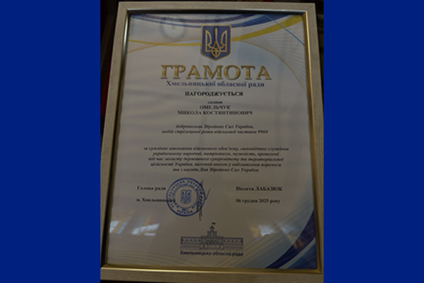 - Нагородження старшого викладача кафедри базової загальновійськової підготовки грамотою Хмельницької обласної адміністрації приурочене до Дня Збройних Сил України