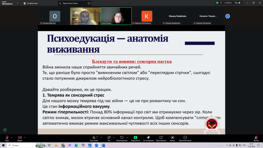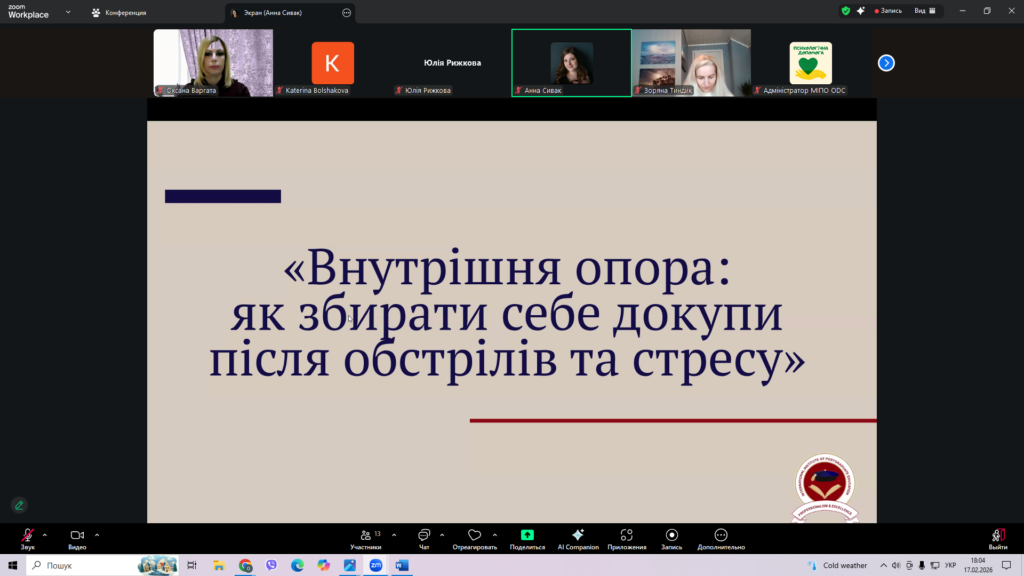 17 лютого 2026 року доцент кафедри базової загальновійськової підготовки Оксана ВАРГАТА кандидат педагогічних наук, прийняла участь у вебінарі «Внутрішня опора: як зібрати себе докупи після стресових подій: обстрілів, блекаутів тощо». Даний проєкт реалізується Міжнародним інститутом післядипломної освіти.